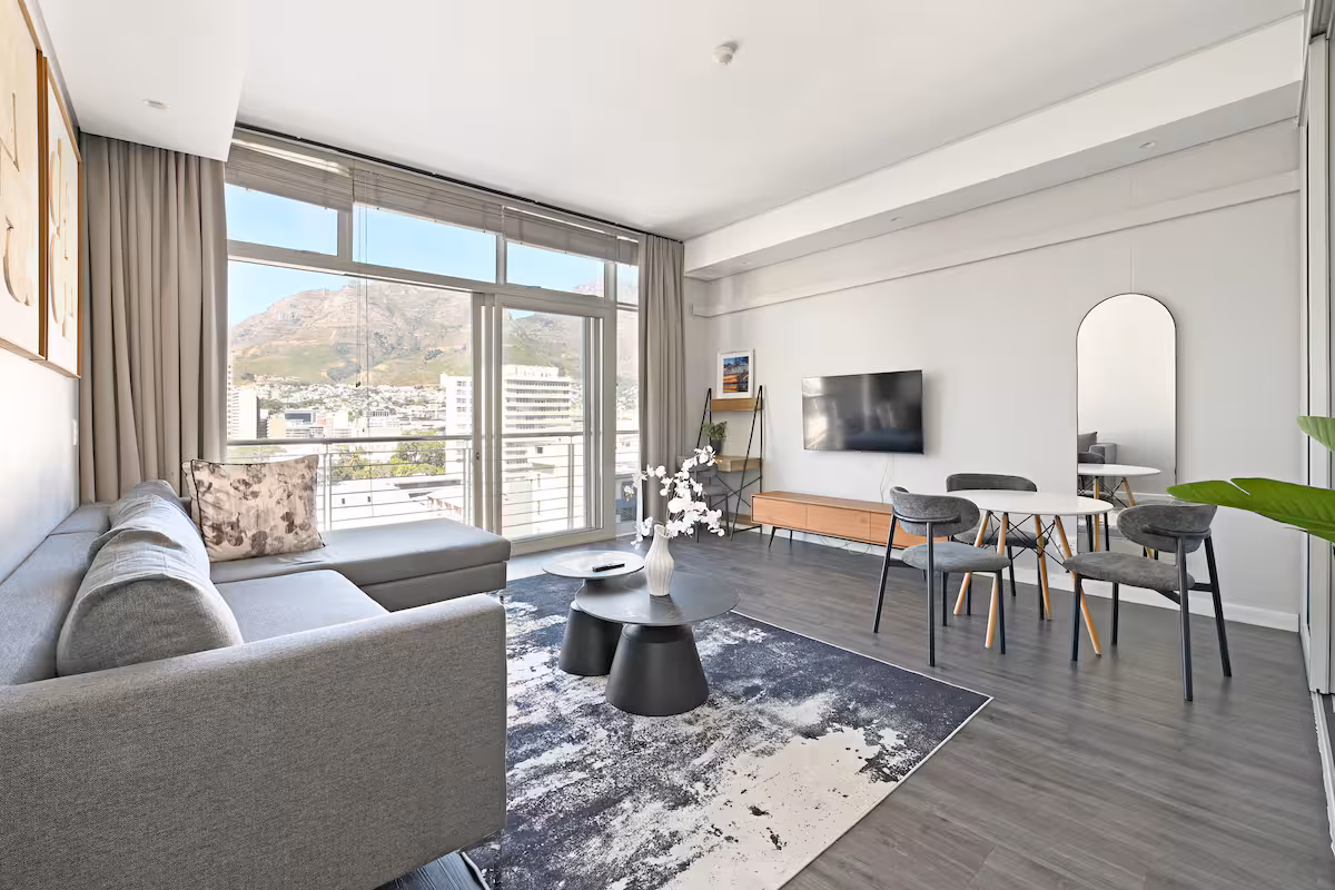 Step into a spacious and beautifully furnished apartment with a Juliette balcony that provides stunning views of the city center and Table Mountain.